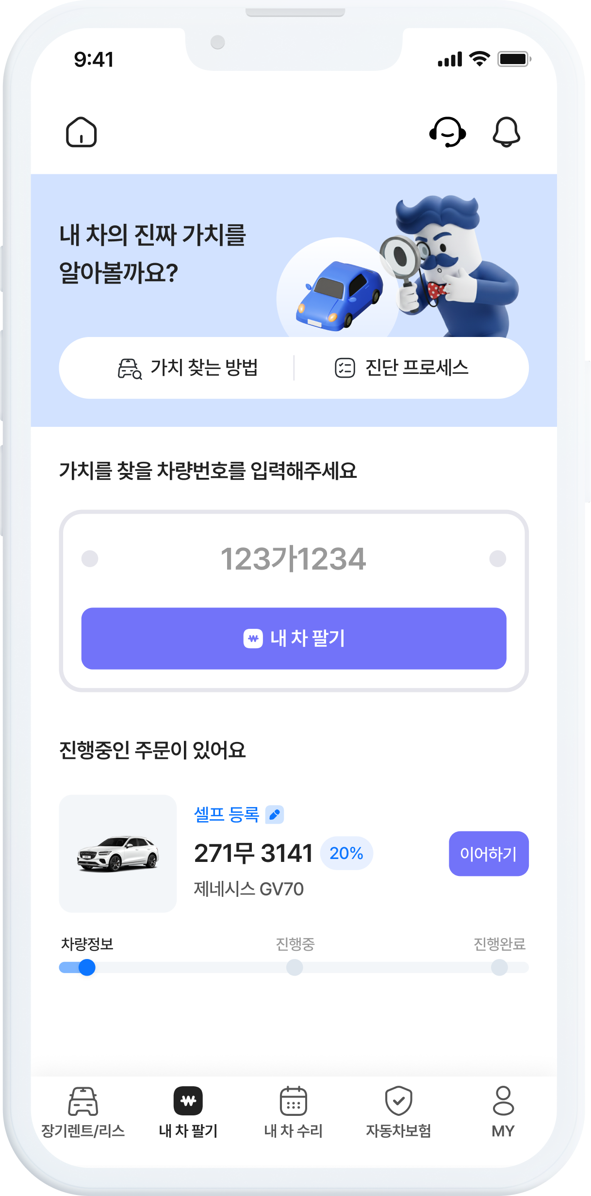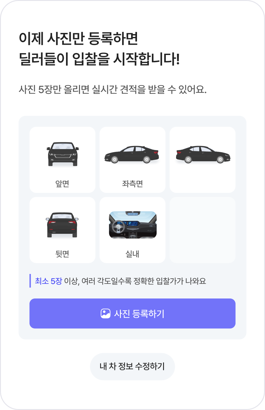 기준이 필요한 경우는 ‘전문진단사 방문평가’,빠르게 진행하고 싶다면 ‘셀프 등록’ 입찰필수 정보와 사진 업로드만으로 빠르게 등록차량 가치를 높이는 제안은 검증된 딜러가 담당합니다.내 차 팔기딜러 경쟁 입찰 (셀프 등록)차량 정보를 직접 등록하면, 등록 즉시 딜러 경쟁 입찰이 시작되는 간편한 방식입니다.전문진단사 평가 등록 후 딜러 경쟁 입찰 (퍼펙트)전문진단사 방문 평가로 기준을 만들고, 딜러가 경쟁해 가격을 제시합니다.