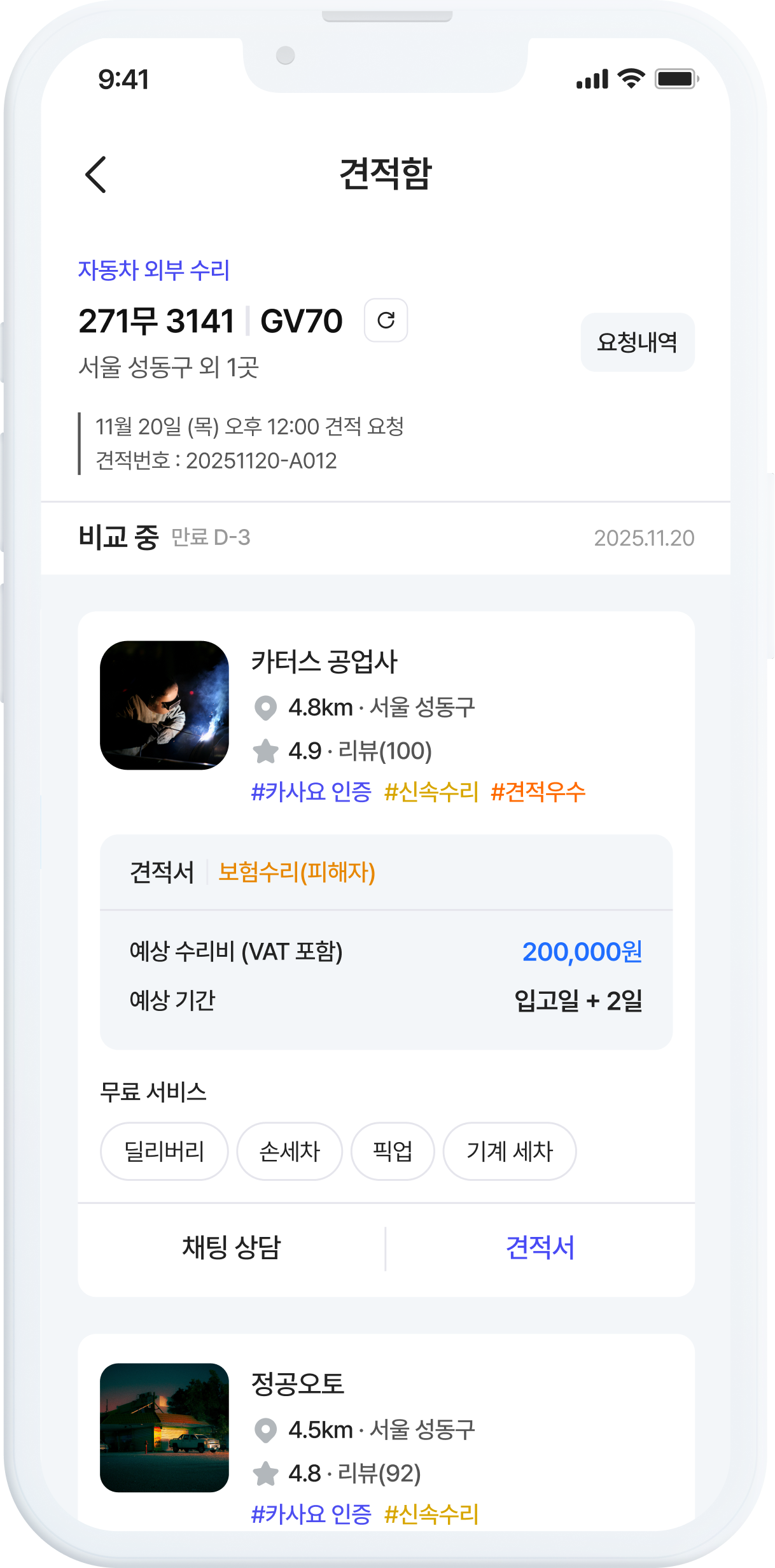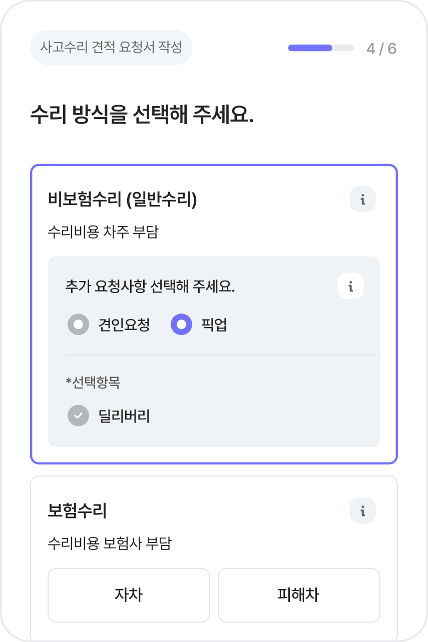 불필요한 수리는 줄이고,꼭 필요한 수리만 합리적인 비용으로안전하게 진행합니다.검증된 정비 기준으로 선별된 공업사 네트워크를 통해내 차 수리 전 과정을 정교하게 관리내 차 수리사고 수리 서비스사고 접수부터 수리 완료까지외부 수리 서비스검증된 전문가의 복원 기술엔진오일 교환 서비스차종에 맞는 최적의 오일타이어 교체 서비스안전한 카사요 인증 업체