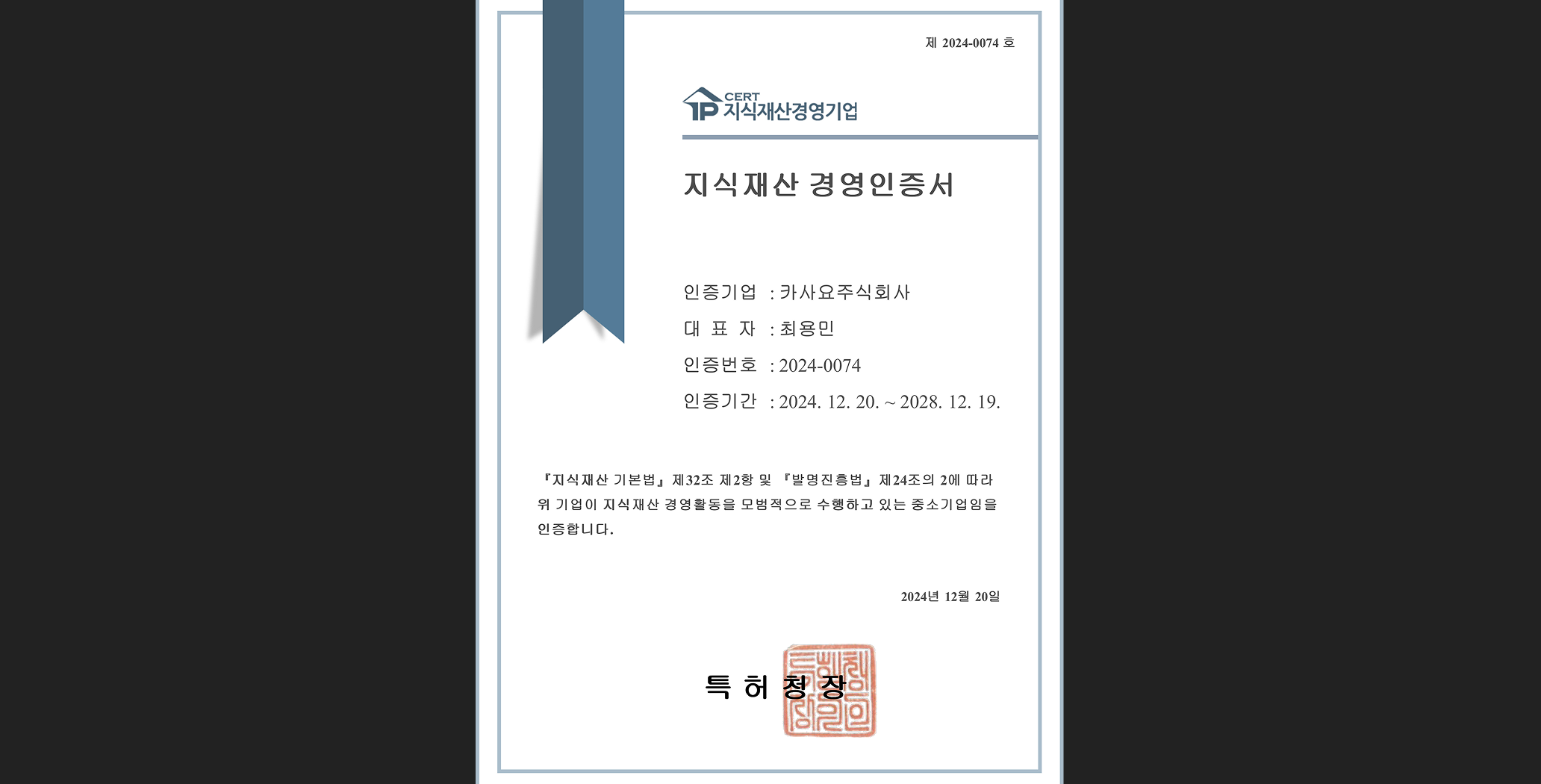 매일경제카사요(주), 제 60회 발명의날’특허청장 표창’ 수상카사요㈜는 인공지능(AI) 기술 및 가격 추적 알고리즘 기술을자동차 관련 비대면 전자상거래 접목 등을 통해 자동차 금융 및 수출 등 관련 산업의 경쟁력 강화에 기여한 점을 인정받아 발명진흥공적수상자로 선정됐다.월간인물카사요㈜ 최용민 대표 카사요는 기술이 기능을 넘어서 시장성과 연결되어야 한다는 원칙, 그리고 IP는 보호의 수단이 아니라 기업 철학의 구조화된 표현이라는 믿음으로 움직이는 기업이다. 실무에서 길어 올린 문제의식을 기반으로 구축된 서비스는 업계 최초로 자동차 보험 중개 플랫폼 특허를 확보했고, 현재 산업재산권(특허) 43건 중 20개의 등록 및 23개의 출원과 102개의 저작권을 보유하며 기술적 독창성을 입증했다.한국일보카사요㈜, 현대이지웰과자동차 복지 서비스 업무협약 체결AI 기반 통합 차량 플랫폼 카사요㈜가 복지몰 시장 1위인 현대이지웰과 손잡고, 장기렌트·리스, 내차팔기, 보험 비교·가입까지 한 번에 처리하는 통합 복지 서비스를 선보인다.헤럴드경제카사요(주), 비즈마켓(구 인터파크비즈마켓)와의 협약 체결자동차 쇼핑 통합 플랫폼 카사요(주)가 최고의 Buying Power(구매력)와 상품 소싱력, 가격 경쟁력을 바탕으로, 선택적 복지 시스템 서비스를 이용하는 이용자 수가 2,000만 명에 달하는 비즈마켓(구 인터파크 비즈마켓)과의 업무 협약을 통해 다양한 혜택을 임직원 및 회원사에 제공한다고 공지했다.경향신문카사요(주), 복지 플랫폼 ‘이제너두’와 업무 협약 체결카사요(주)(대표 최용민)는 선택적 복지제도 전문기업 이제너두㈜(대표이사 송동진)'와 전략적 업무 협약을 체결하고, 자사의 자동차 서비스를 이제너두 회원사에 제공한다고 밝혔다. 이번 협약을 통해 AI 기반 통합 모빌리티 플랫폼으로서의 역할을 복지 서비스 영역으로 확장하게 됐다.동아일보카사요, 베네피아와 업무 협약 체결AI 모빌리티 플랫폼 카사요㈜가 선택적 복지 플랫폼 베네피아와의 제휴를 통해 임직원 전용 자동차 혜택을 제공한다고 밝혔다. 베네피아 회원이라면 장기렌트, 신차 리스, 내 차 팔기까지 원스톱으로 이용할 수 있는 카사요의 프리미엄 서비스를 누릴 수 있다.뉴스1카사요, 특허청 주관'지식재산경영인증' 획득최용민 카사요 대표는 "지식재산경영인증 획득은 26년 간의 업계 경험과 차별화된 특허·인증을 기반으로 카사요의 기술력과 경영 전략을 인정받은 결과"라며 "독창적인 기술력과 서비스 혁신을 통해 자동차 금융·보험 시장에서 경쟁 우위를 확보해 나갈 것"이라고 말했다.중앙일보카사요, 소비자중심경영인증 획득자동차 쇼핑 통합 플랫폼 카사요(주)가 9일 서울 롯데호텔 월드 크리스탈볼룸에서 열린 2024년 소비자중심경영(CCM) 인증서 수여식에서 업계 최초로 인증을 획득했다.가족친화기업인증여성가족부 인증 획득기술혁신형 중소기업(Inno-Biz) 인증중소벤처기업부 인증 획득경영혁신형 중소기업(MAIN-BIZ) 인증중소벤처기업부 인증 획득벤처 기업 인증(혁신 성장형)중소벤처기업부 벤처인증 획득지식재산경영기업 인증특허청 인증 획득소비자중심경영(CCM)기업 인증공정거래위원회 인증 획득가족친화기업인증여성가족부 인증 획득기술혁신형 중소기업(Inno-Biz) 인증중소벤처기업부 인증 획득경영혁신형 중소기업(MAIN-BIZ) 인증중소벤처기업부 인증 획득벤처 기업 인증(혁신 성장형)중소벤처기업부 벤처인증 획득지식재산경영기업 인증특허청 인증 획득소비자중심경영(CCM)기업 인증공정거래위원회 인증 획득